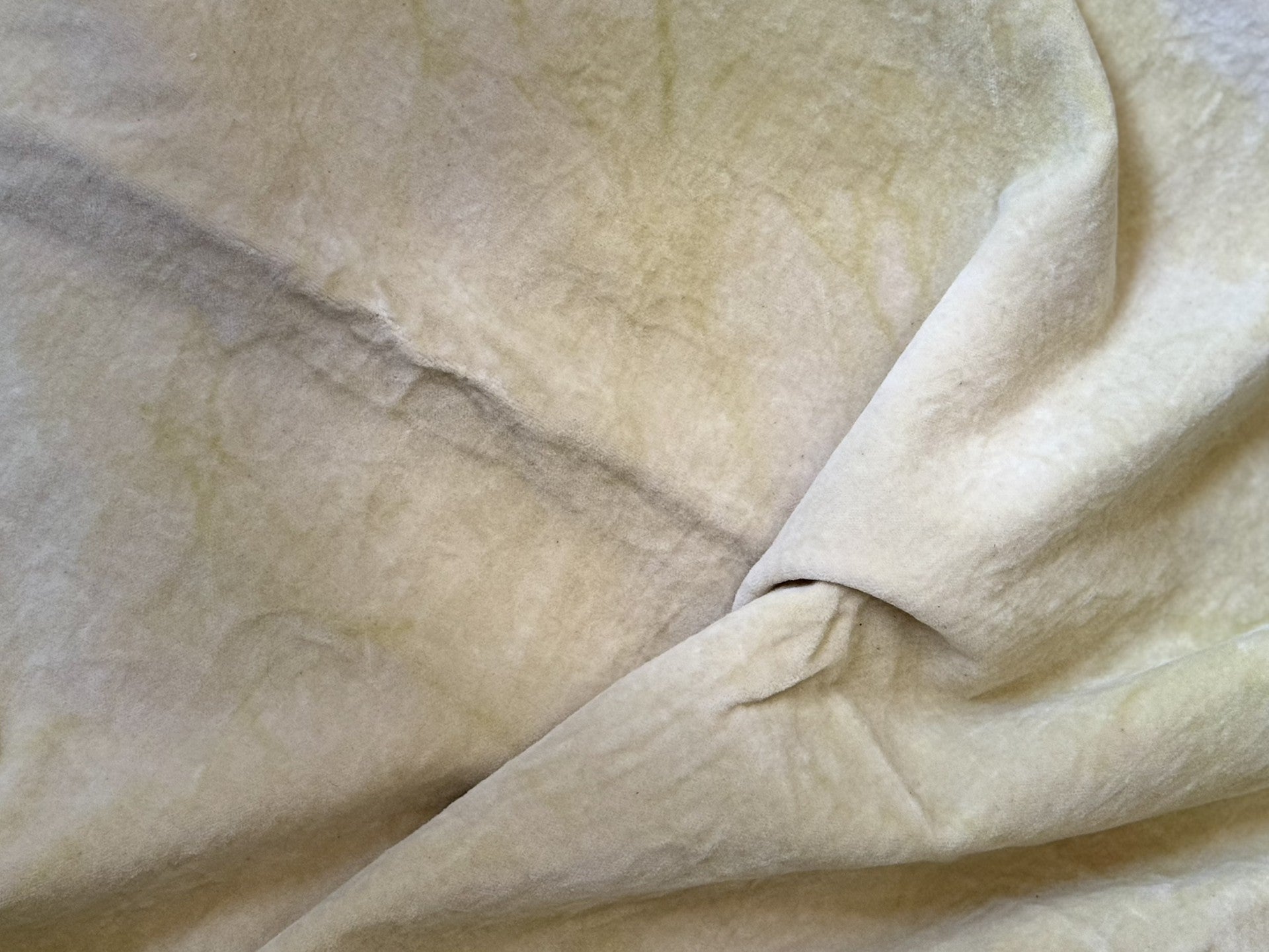 This is "hand-dyed" fabric. It is mottled in color and has a wonderful primitive look. Best for craft projects. Some colors are more mottled than others. Our Parsnip Velvet is slightly mottled in the color. This is a creamy beige colored velvet with slight hues of yellow and green. This reminds me of the outer peel of a Parsnip, hence it's name!