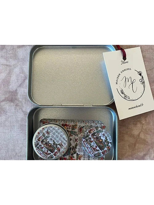 This small tin box (illustration Louisa Lallier sampler) measures 110mm x 80 mm x 24mm (4.33 " x 3.15 " x 0.95") and contains: