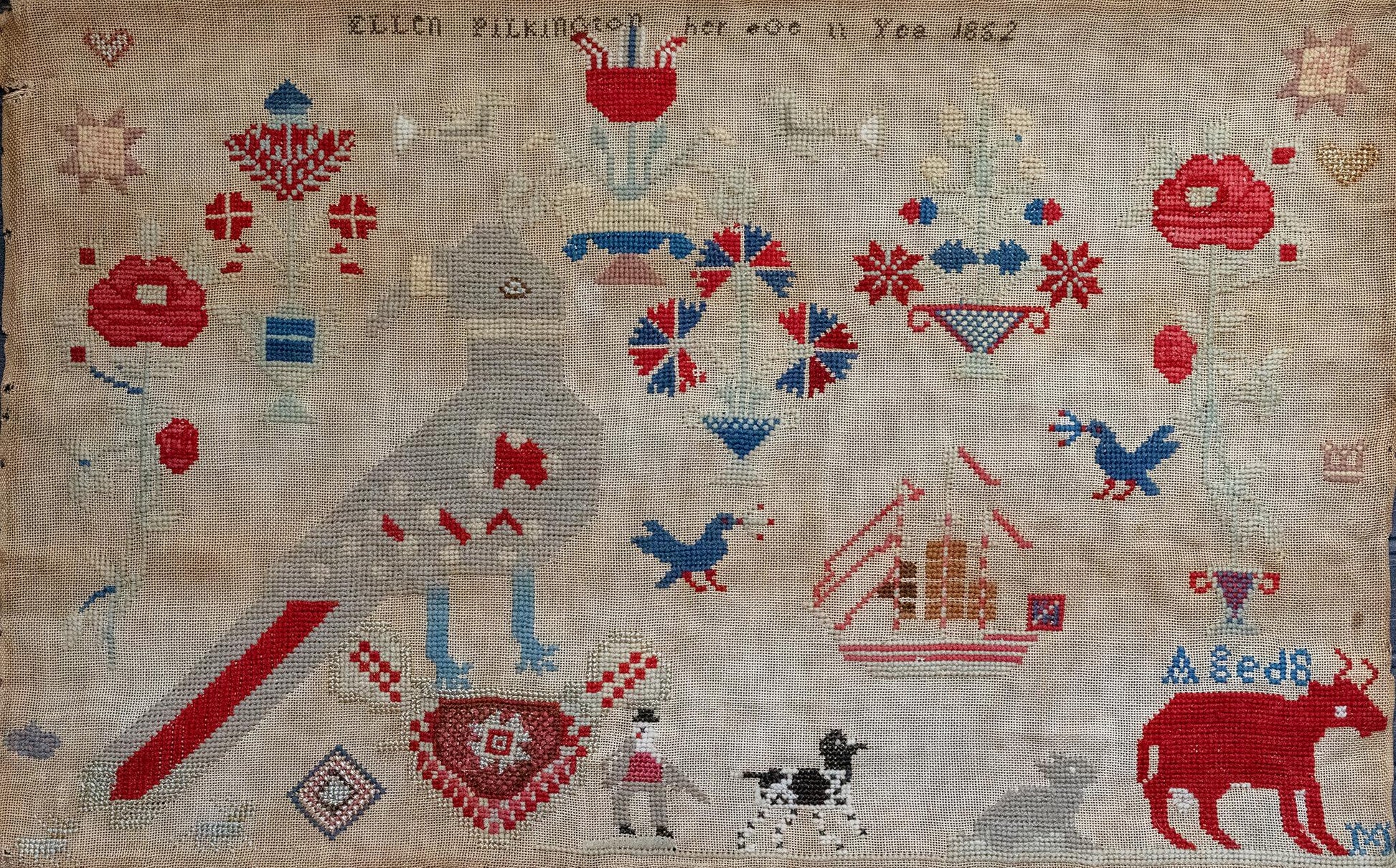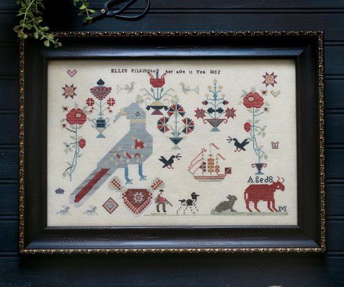 Threads: Weeks Dye Works Floss: Glacial Melt, Artichoke, Flatfish, Chestnut, Williamsburg Red, Chickpea and Classic Colorworks Floss: Cherry Cobbler, Brown Sugar, Deep Fennel, Green Onion, Eggshell and Gentle Art Threads: Blackboard, Aged Pewter, Flax, Espresso, Holly Berry, Summer Shower with DMC conversion provided.