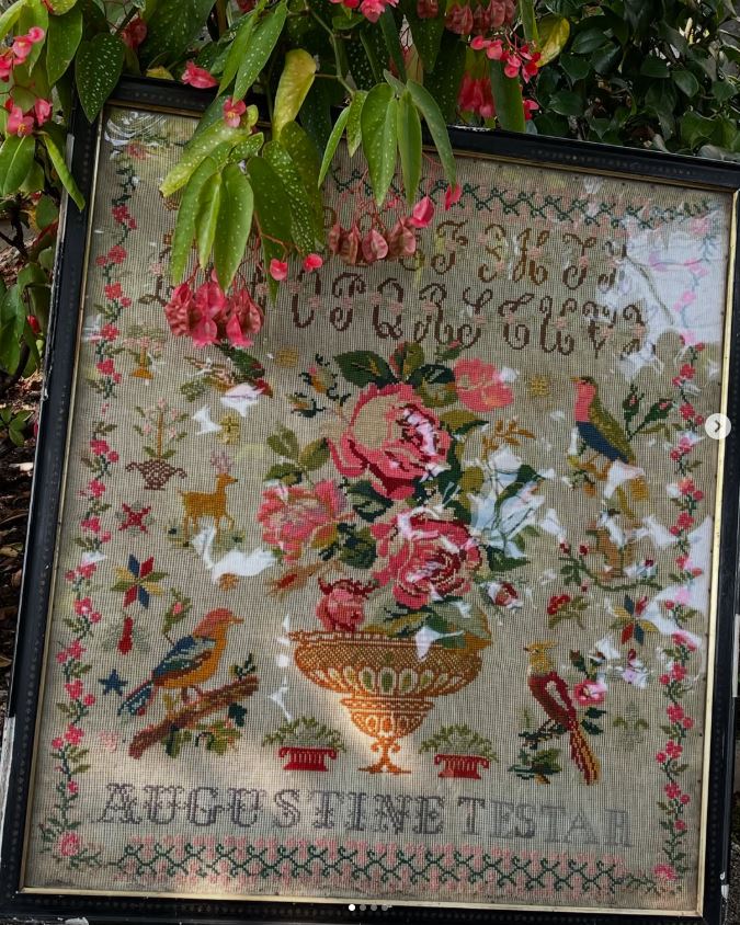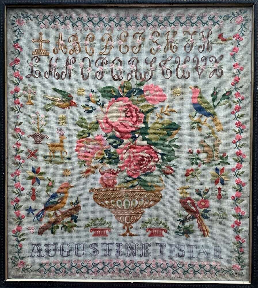 A superb reproduction sampler featuring a blowsy rose urn and many birds, a deer and even a squirrel!