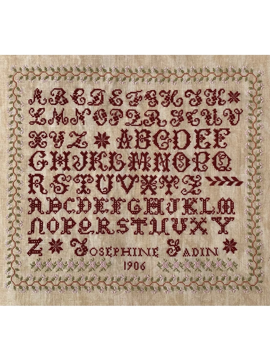 What a delightful red alphabet reproduction sampler, with a border of violets.