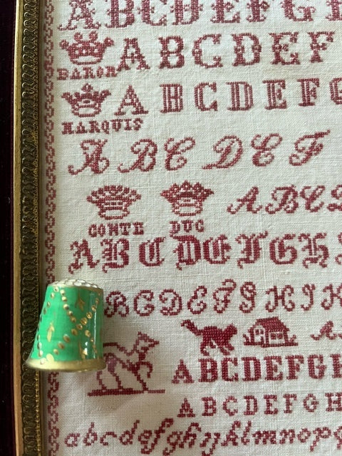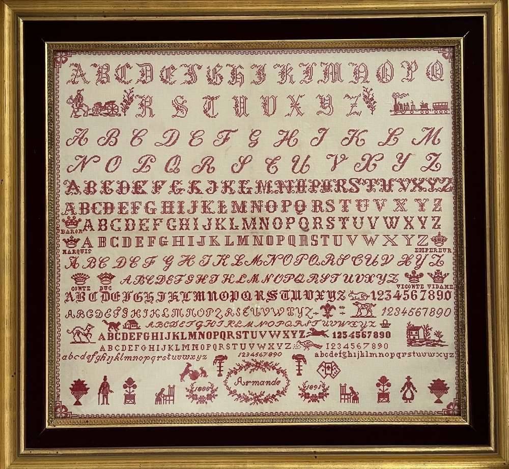 Reproduction of an antique sampler; Armande stiched her sampler between 1888 and 1891 and her original was finely stitched and measures 34 x 37 cm.