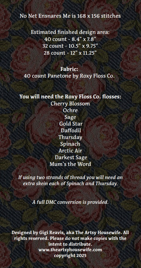 Threads: Roxy Floss Co Cherry Blossom, Ochre, Sage, Gold Star, Daffodil, Thursday, Spinach, Arctic Air, Darkest Sage, Mum's the Word with full DMC conversion.